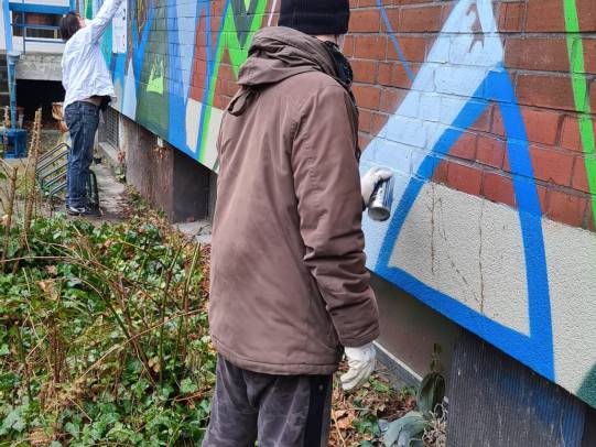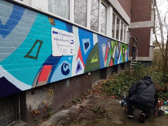 Unter Anleitung des Graffitikünstlers und Sozialarbeiters Sinan Dur von kunstrettetkiez.de konnte das Orientierungshaus in einem Workshop unserer Häuserfassade einen neuen Look verleihen.