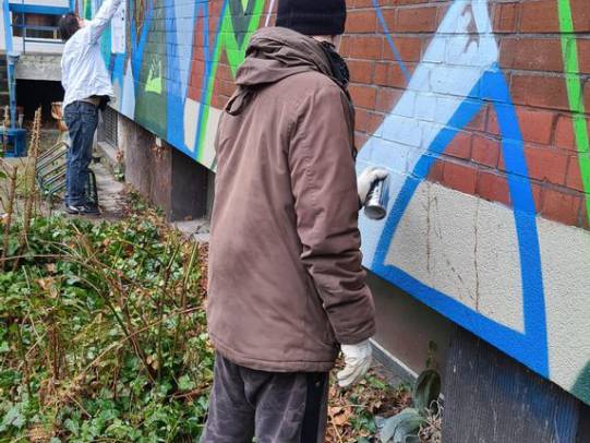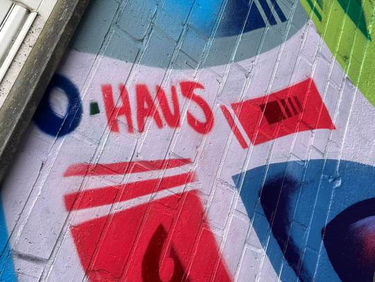Unter Anleitung des Graffitikünstlers und Sozialarbeiters Sinan Dur von kunstrettetkiez.de konnte das Orientierungshaus in einem Workshop unserer Häuserfassade einen neuen Look verleihen.