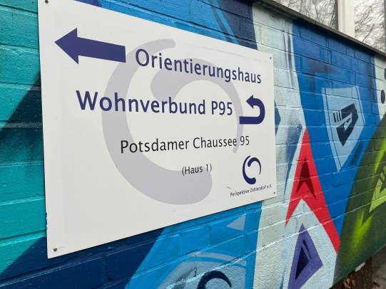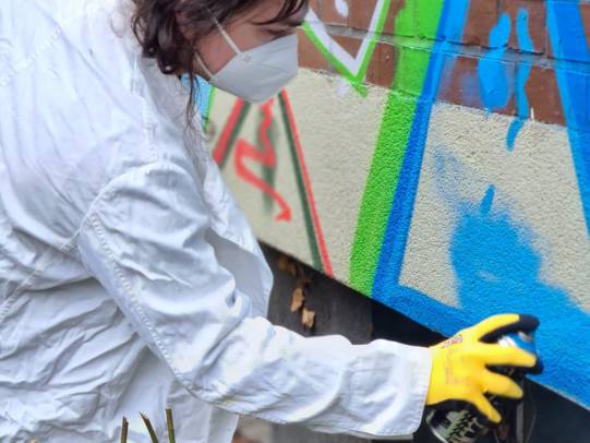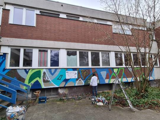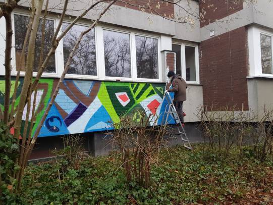 Unter Anleitung des Graffitikünstlers und Sozialarbeiters Sinan Dur von kunstrettetkiez.de konnte das Orientierungshaus in einem Workshop unserer Häuserfassade einen neuen Look verleihen.